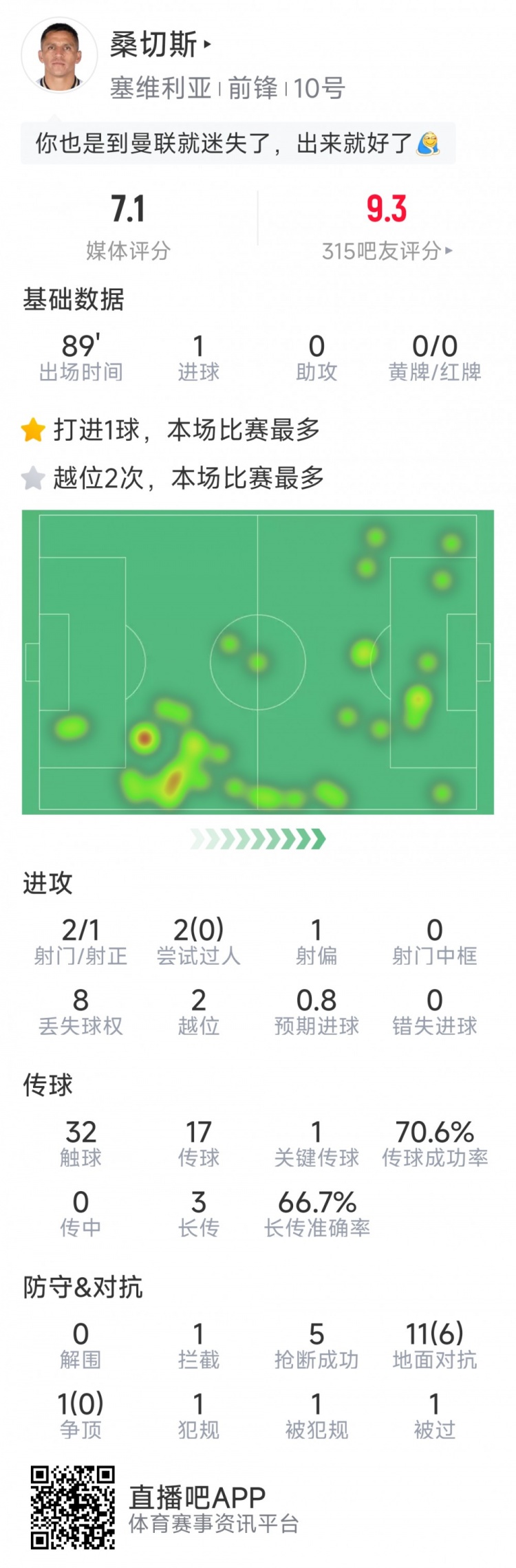 10月6日讯 在本轮西甲,塞维利亚4-1击败巴萨。本场比赛桑切斯面对旧主破门,以下为他在本场数据: