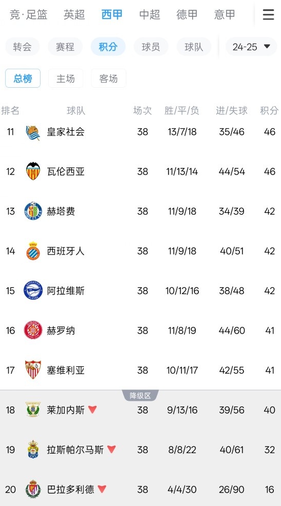 而在上赛季,塞维利亚情况则大不相同,整个赛季,他们10胜11平17负,最终拿到41分,仅以1分优势保级成功。