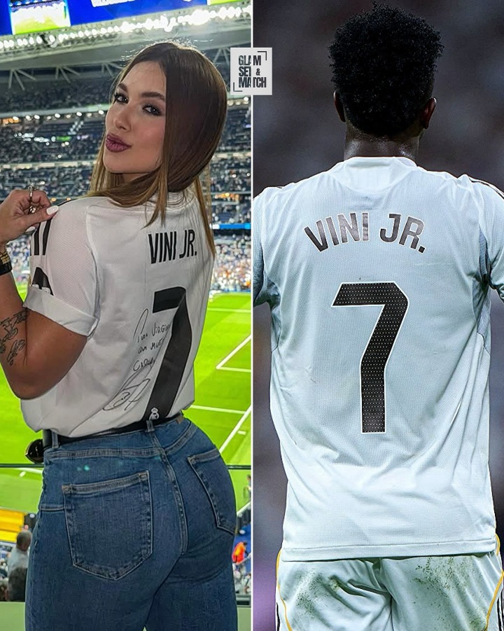 她秀出了自己穿皇马球衣的照片,并晒出维尼修斯的7号以及球衣上的亲笔签名。