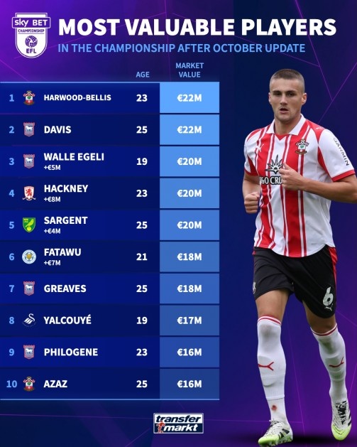 英冠最新身价前十:贝利斯、戴维斯2200万欧居首,伊镇4人在列