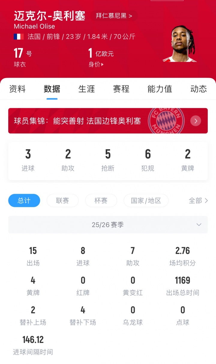 奥利塞现年23岁,司职右边锋,他本赛季为拜仁出战15次,贡献8球7助,他与拜仁的合同在2029年到期,现身价1亿欧。拜仁方面声称无意出售奥利塞,并希望在未来继续留住他,据悉,奥利塞与拜仁没有解约金条款。