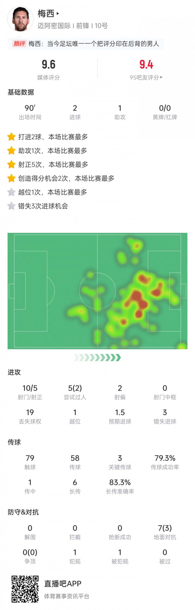 2射1传!梅西本场数据:10次射门5次射正,错失3次机会,评分9.6