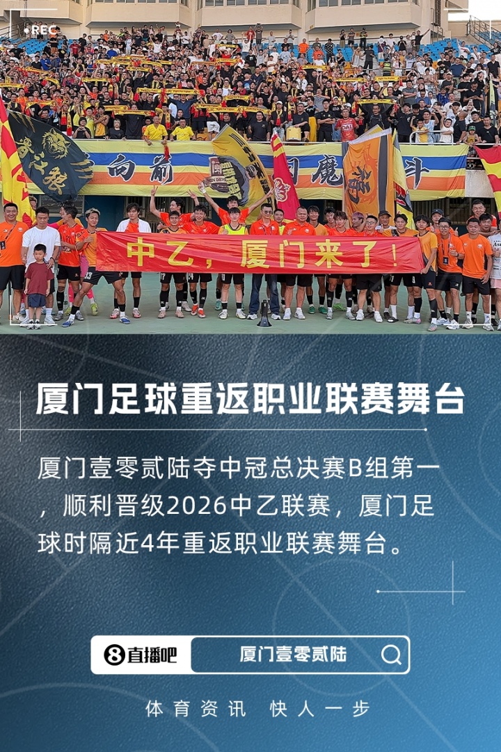 今年厦门壹零贰陆在中冠联赛打出好成绩,最终以分组第一提前锁定中乙名额!2025年,厦门足球重回职业化舞台。