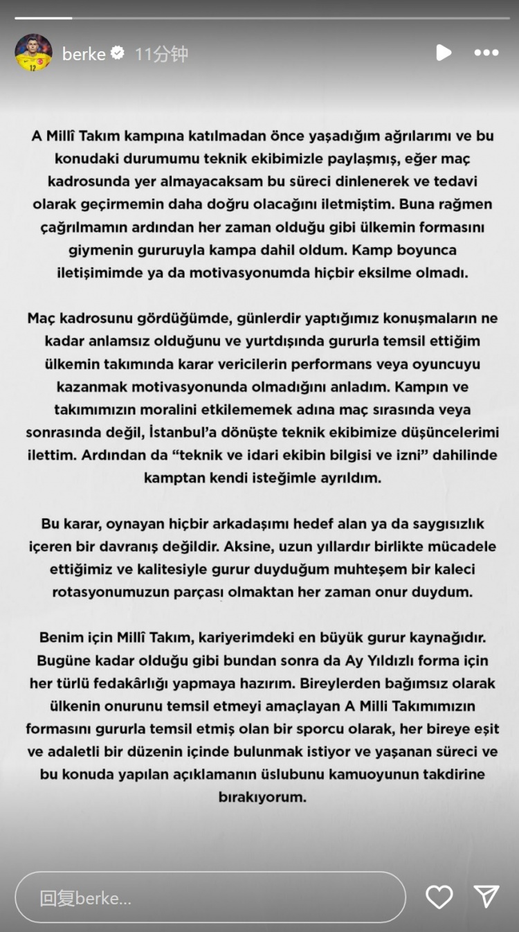 当看到比赛名单时,我才意识到这些天来的沟通毫无意义——那些在海外为国争光的球员,在国家队决策者眼中,其表现和斗志根本不被重视。为避免影响集训营和球队士气,我选择在返回伊斯坦布尔后向技术团队传达了我的想法,而非在比赛期间或赛后,随后在‘技术和管理团队知情并同意’的情况下,我自愿离开了集训营。