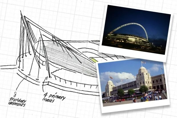 福斯特不仅认为其外观不佳,更关键的是,四个桅杆会直接穿过球场重要的款待区,严重影响内部空间。于是,在方案公布后的一个周末,设计团队经历了“疯狂的24小时”,福斯特本人不断绘制草图与团队沟通,最终催生了如今的拱门设计。这个巧妙的方案不仅解决了内部空间问题,其133米的高度也使其成为一个可以从伦敦市区遥望的宏伟地标。
