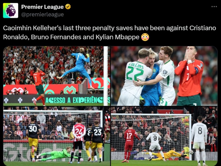 10月12日讯 英超官方发布数据,凯莱赫近3次扑点分别扑出了C罗、 B费和姆巴佩的点球。