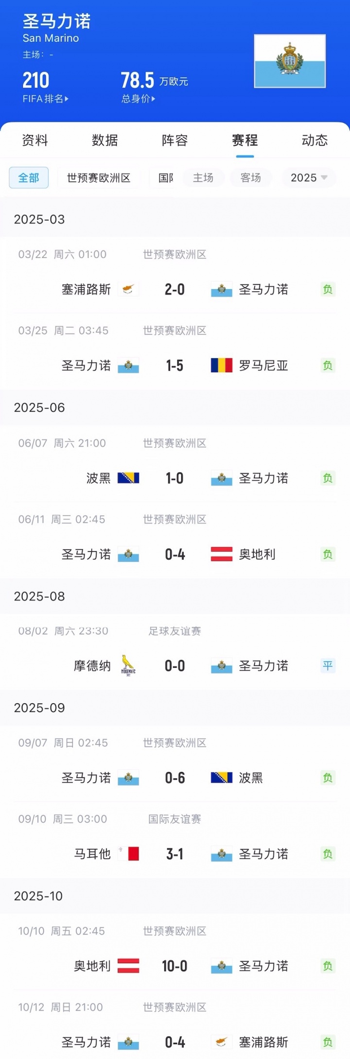 2025年至今,圣马力诺共出战了9场国际比赛,取得了1平8负的战绩,进失球比为惨淡的2-35。