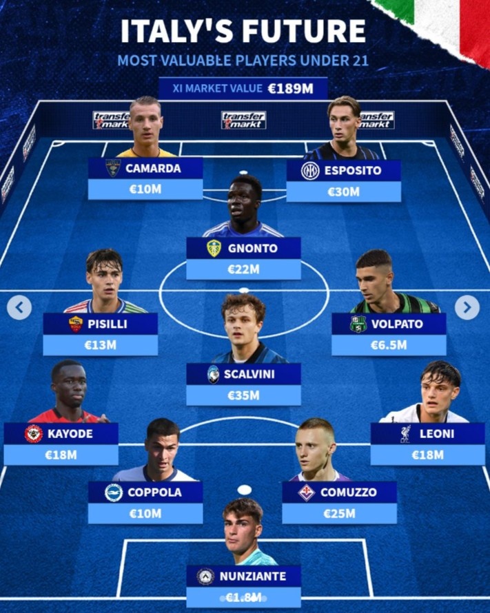 意大利U21最贵阵:莱奥尼、皮奥-埃斯波西托在列,总身价1.89亿欧