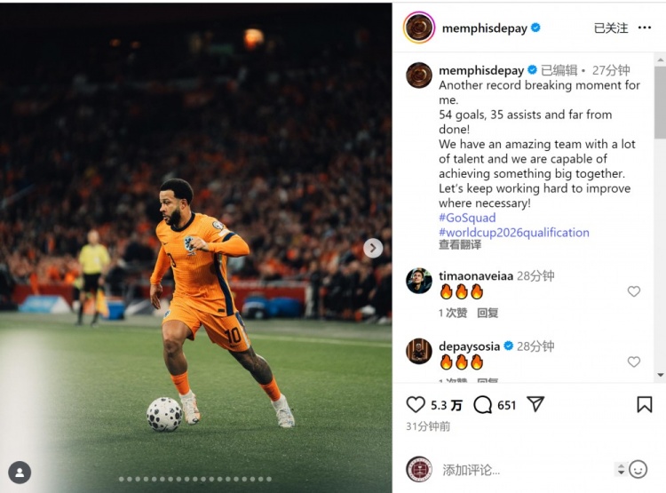 德佩社媒晒出比赛照片,并写道:“对我来说又是一个打破纪录的时刻。 54个进球,35次助攻,而且远未结束!”