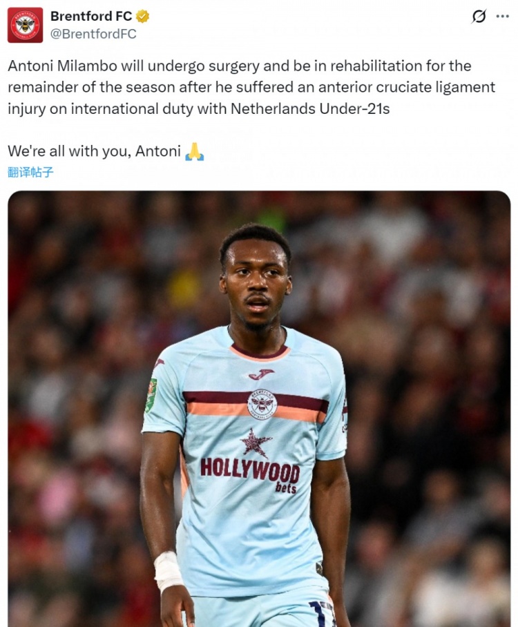 10月15日讯 布伦特福德官方确认,队内20岁中场米兰博前交叉韧带(十字韧带)受伤。