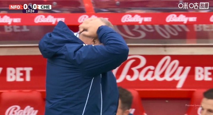 比赛第20分钟,切尔西后防乱成一团,吉布斯-怀特1分钟内错失2次良机。澳波在场边十分懊恼。