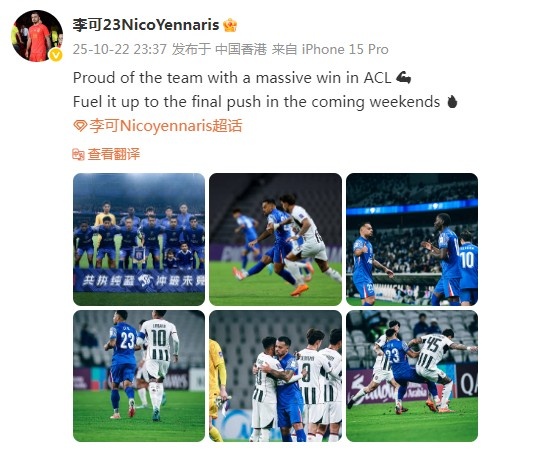 10月23日讯 亚冠精英第3轮比赛,申花主场2-0击败首尔FC,取得新赛季亚冠首胜。赛后,李可在社媒庆祝了这场胜利。