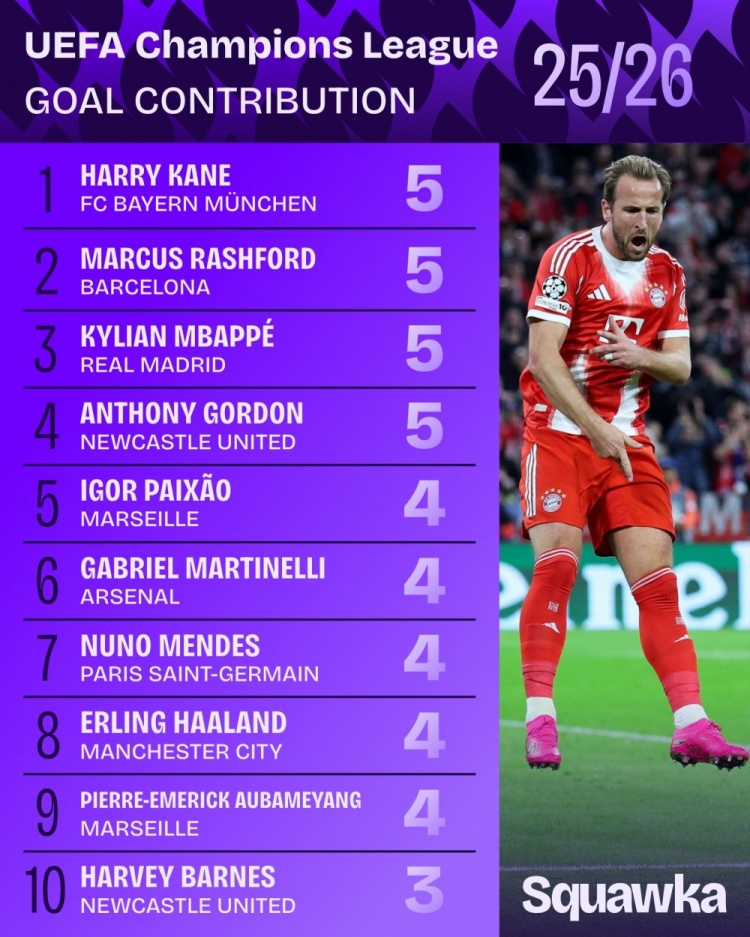 10月23日讯 本赛季欧冠联赛阶段已战罢3轮,Squawka统计了到目前为止的参与进球榜,拜仁前锋凯恩、巴萨攻击手拉什福德、皇马的姆巴佩以及纽卡边锋安东尼-戈登均参与5球。