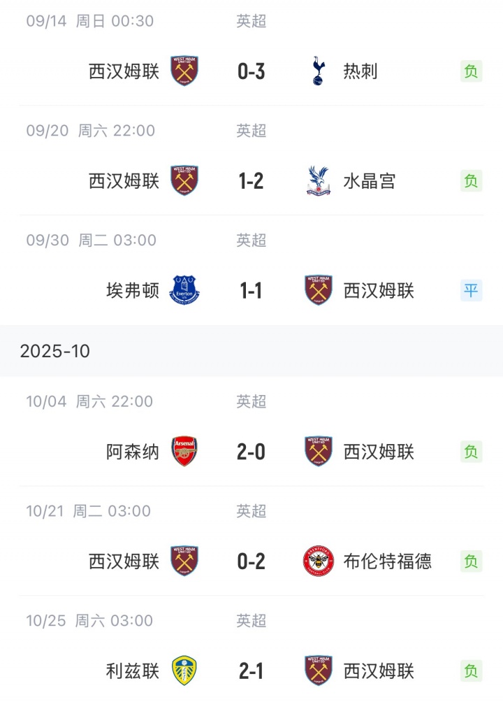 西汉姆1胜1平7负,先赛暂排倒数第二,联赛已三连败、六场不胜。