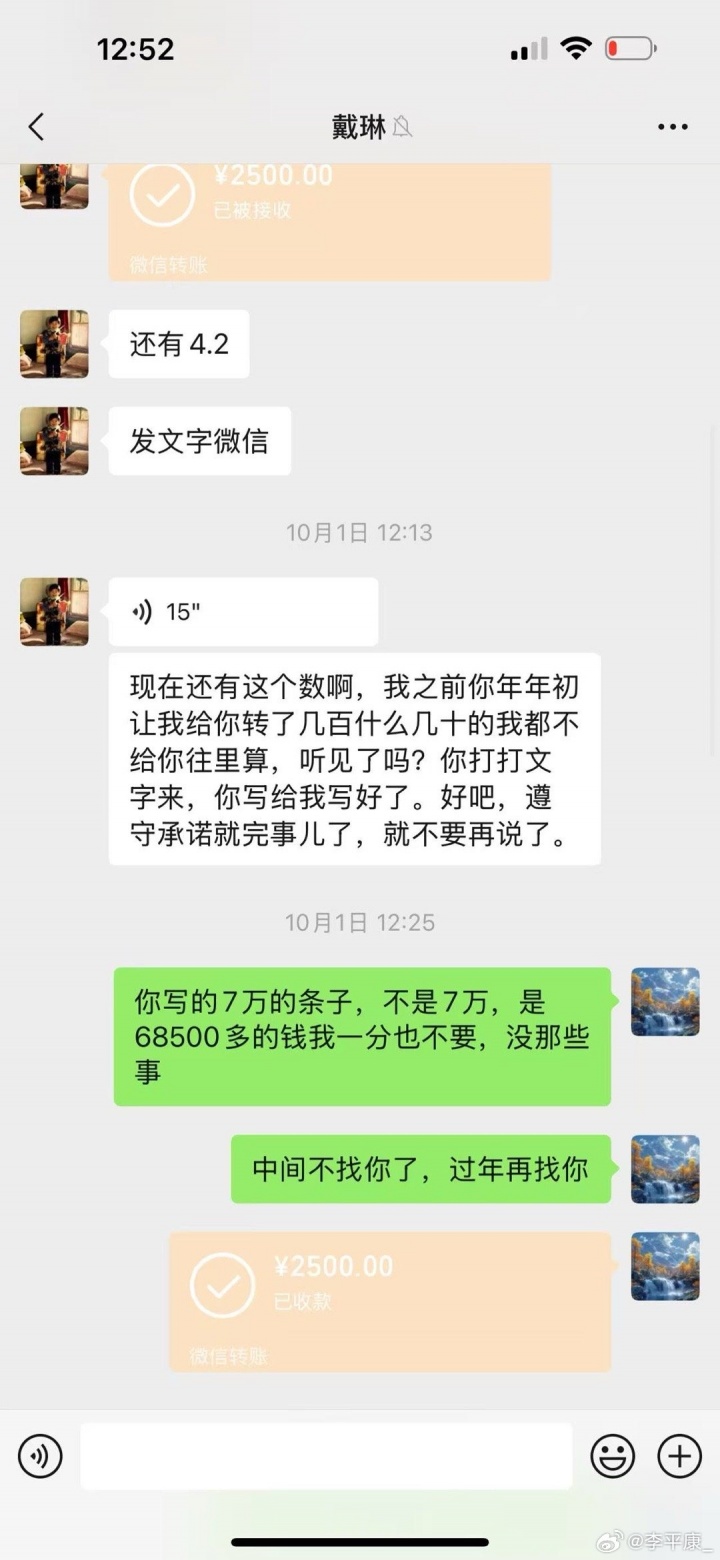 逾期两年半李平康晒7万借条爆料戴琳借钱不还,300块都拿不出