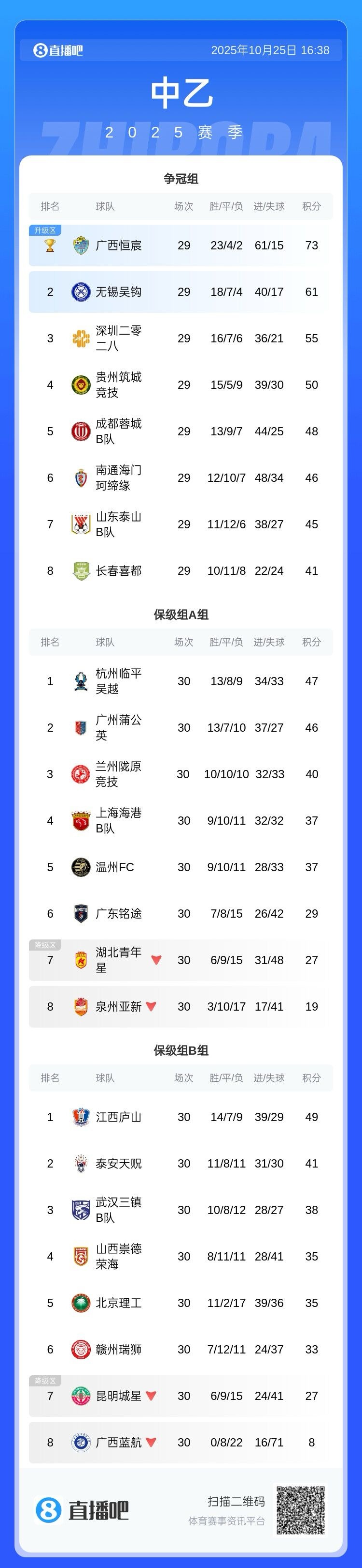10月25日讯 2025赛季中乙联赛保级组结束全部争夺,保级组A组,湖北青年星、泉州亚新降级,保级组B组,昆明城星、广西蓝航降级。