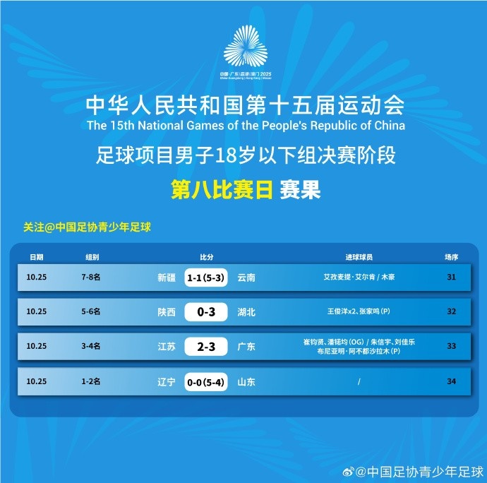 全运会U18男足排名:辽宁队夺得金牌 山东队获银牌 广东队获铜牌