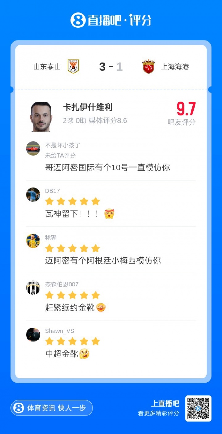 而卡扎伊什维利合同今年年底到期,至今没有续约的消息,有多家中超球队对他虎视眈眈。在评分中,多位泰山球迷呼吁留下他↓