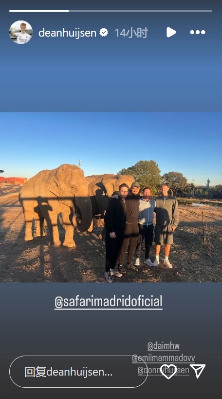 当地时间周一,皇马后卫赫伊森与亲友前往马德里野生动物园游览,他在个人社媒晒出与大象的合照。