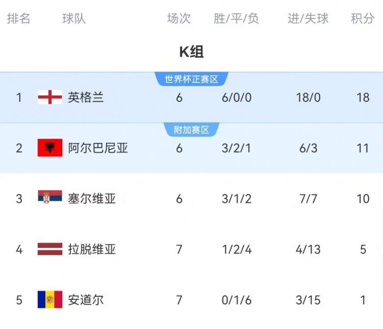 他们当前在6轮小组赛后积10分,暂列小组第3。榜首英格兰18分领跑,第2名阿尔巴尼亚则为11分。
