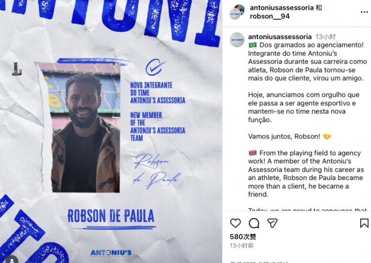 该公司公告写道:“从球员转型到经纪工作!我们将迎来一位前职业足球运动员罗伯森,他将成为我们的新伙伴。我们很荣幸地宣布,他将成为一名体育经纪人,以新的身份和我们一同共事。让我们一起努力,罗伯森!”