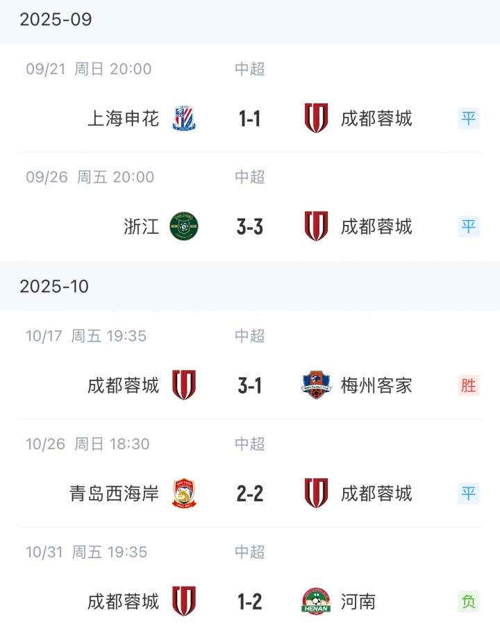 最后阶段狂丢分!蓉城近5轮仅1胜丢9分,原2分领跑现直接退出争冠