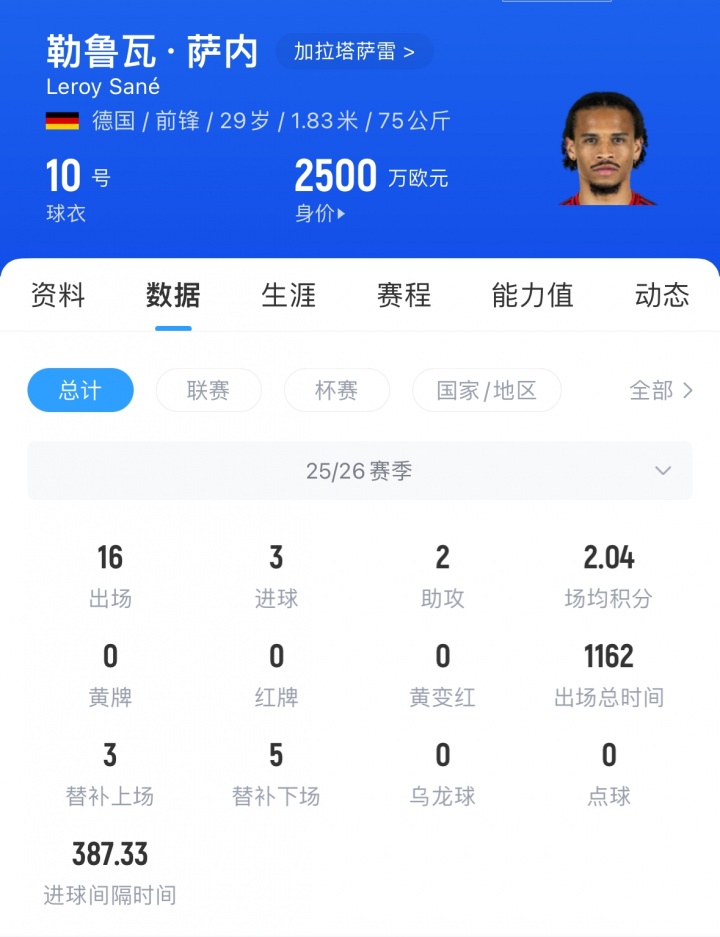 本赛季萨内代表加拉塔萨雷出战16场比赛,贡献3粒进球和2次助攻,其中土超11轮3球1助。