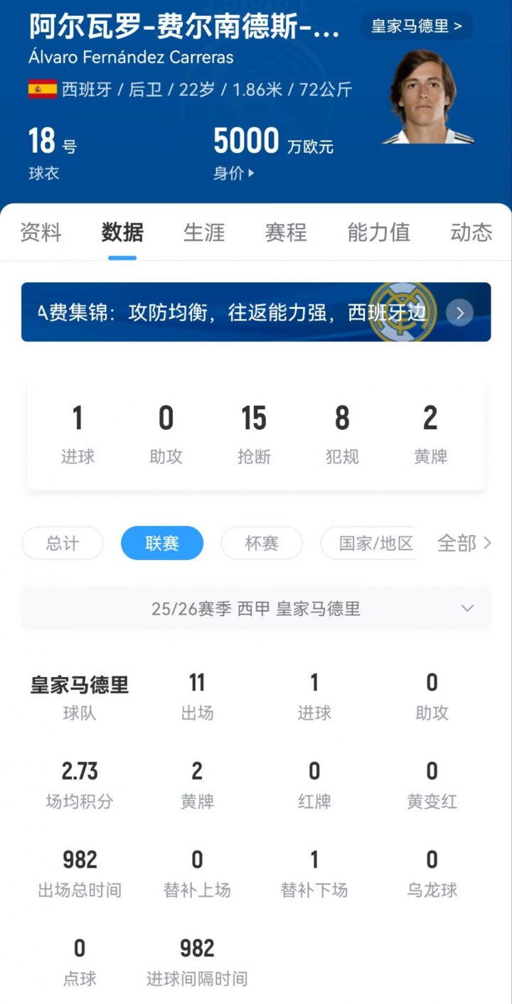 今年夏窗卡雷拉斯被皇马看上,他以5000万欧的总价被带回伯纳乌。上个月德转进行的新一波身价更新,已经占据皇马主力左边卫位置的卡雷拉斯身价继续猛涨,达到5000万欧。