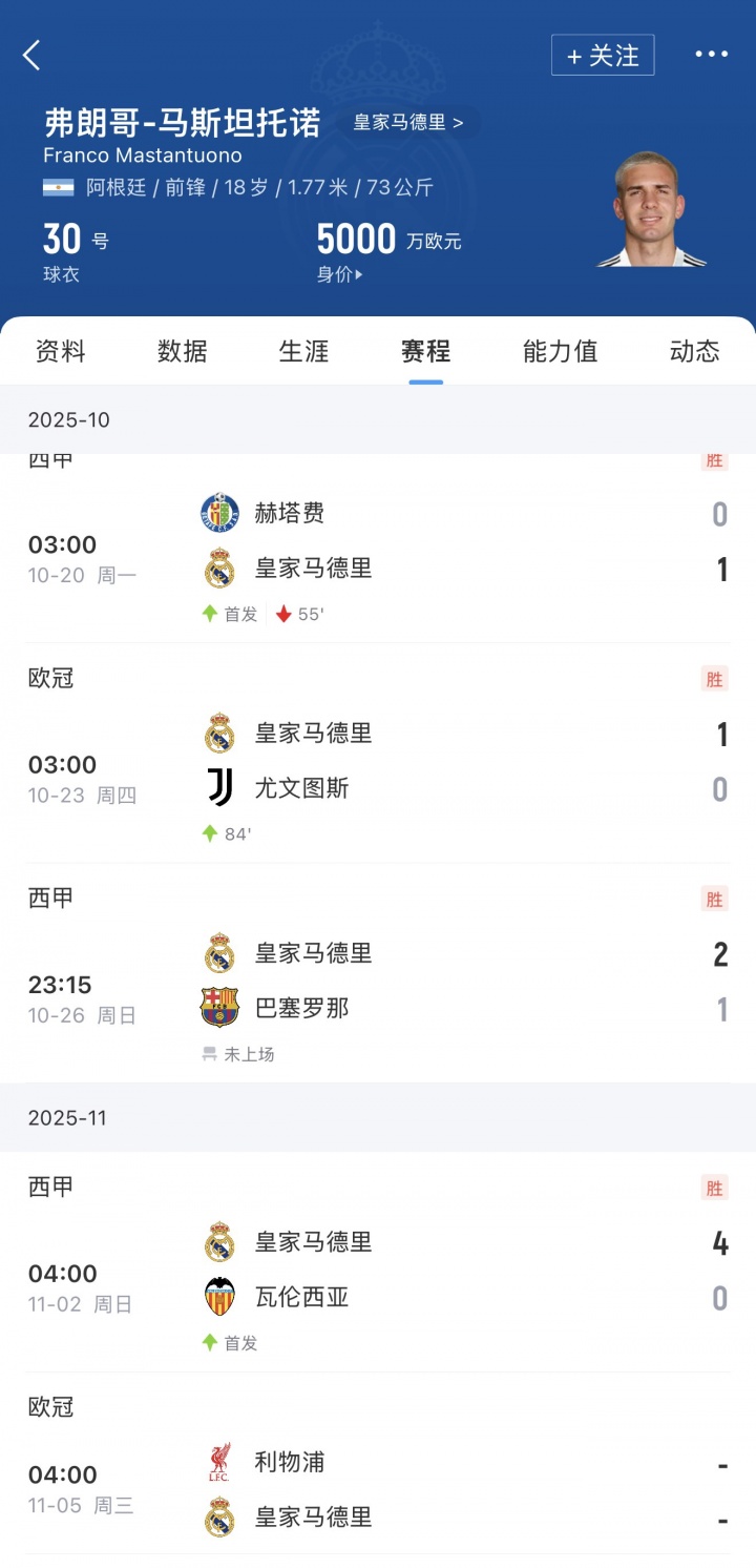 马斯坦托诺本赛季在西甲出场9次打入1球,他没有出战皇马2-1巴萨的比赛,但在皇马4-0瓦伦的比赛中首发打满全场。