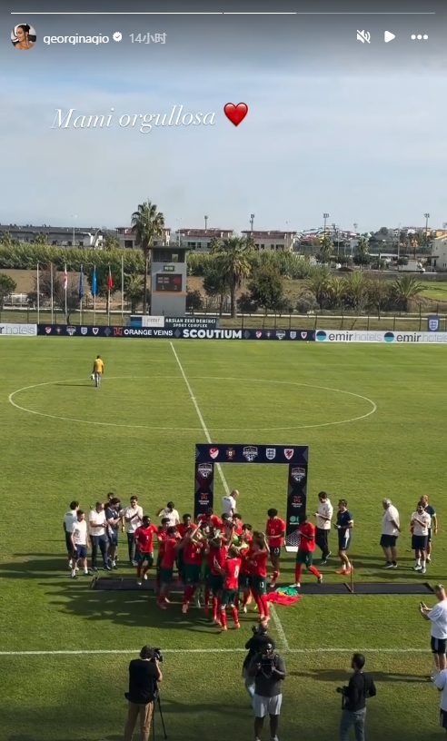 乔治娜在个人社媒晒出迷你罗和队友庆祝的视频,同时写道:骄傲的妈妈。