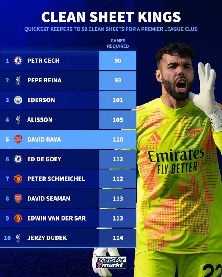 英超门将最快50场零封排行榜:拉亚跻身前五,切赫和雷纳排名一二