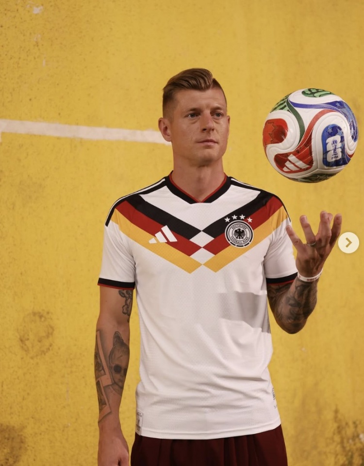 克罗斯为德国队世界杯版阿迪达斯战袍宣传预热,并打趣:别担心啦,我不会再(在赛场上)穿这件球衣了,虽然似乎看起来这球衣简直像是在恳求我穿上它。不过话说回来,短裤也很不错。