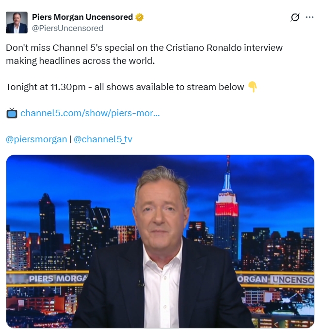 11月07日讯 著名主持人皮尔斯-摩根发布预热视频,C罗专访的特别节目将于英国时间今晚23:30(北京时间11月8日早7:30)在BBC播出。