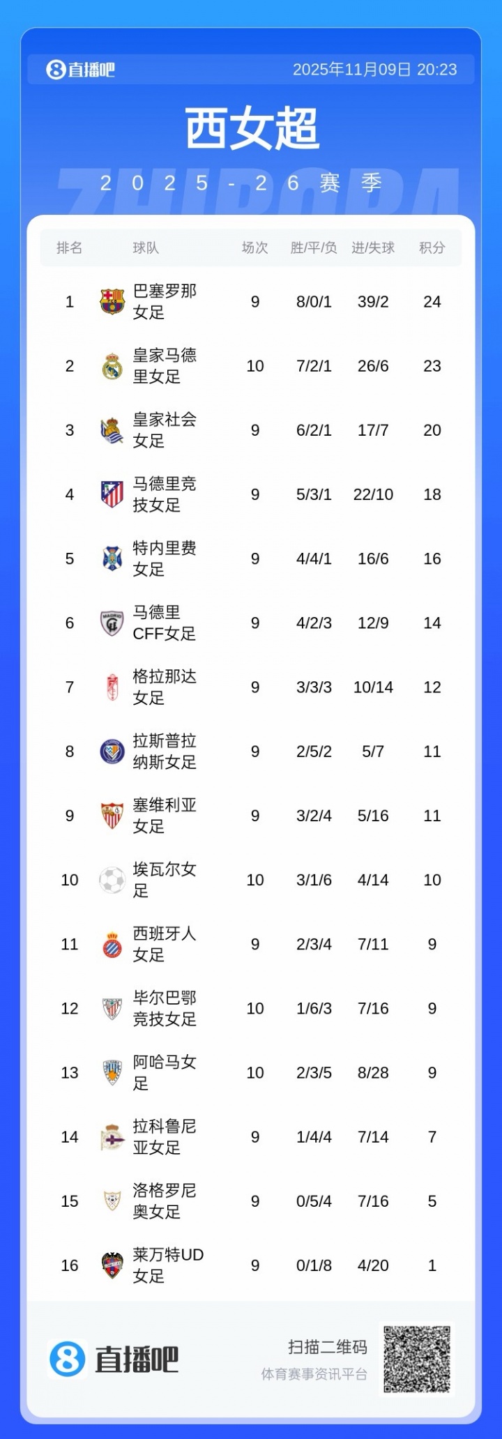 值得一提的是,巴萨女足目前也排在联赛积分榜榜首,此前9轮8胜1负,狂进39球仅丢2球,暂时领先先赛一场的皇马女足1分。