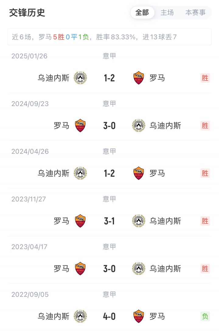 罗马联赛7胜3负积21分,乌迪内斯联赛4胜3平3负积15分。罗马对阵乌迪内斯已获5连胜。