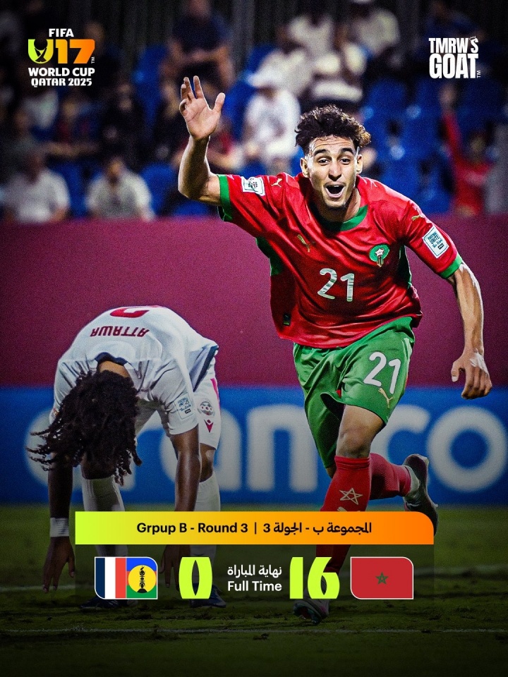 11月09日讯 2025卡塔尔U17世界杯B组第3轮,摩洛哥U17以16-0狂胜新喀里多尼亚U17,3战1胜2负排名小组第3。