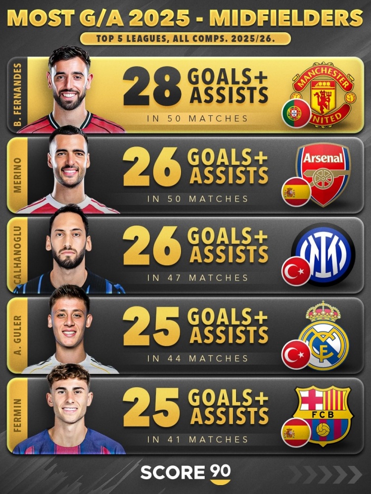 2025年中场参与进球榜:B费28球居首,梅里诺、恰尔汗奥卢26球