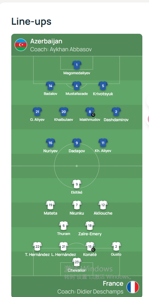 法国vs阿塞拜疆首发:姆巴佩缺阵,埃基蒂克、恩昆库、科纳特先发
