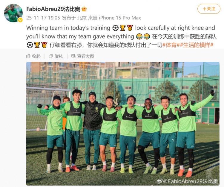 11月17日讯 国安球员法比奥更新社媒,他的团队在队内对抗获胜。