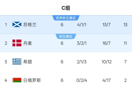 最终,苏格兰4-2丹麦,小组第一晋级世界杯;丹麦仍积11分,排在小组第二位,将征战附加赛。